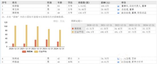 而公司去年增利不增收的背景下,公司高管薪酬纷纷下降。隋君美2024年薪酬为25.22万元,相较于2023年的35.61万元,下降了10.39万元,是公司副总经理中降薪最多的,但仍为三位副总经理中的最高薪酬,但比董事长杨君敏低了不少。杨君敏薪酬由2023年的108.1万元下调至2024年的108.0万元,是公司高管中唯一薪酬超百万的。