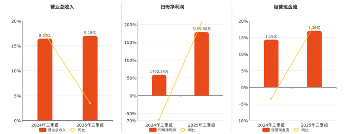公司营业总收入为9.18亿元,在已披露的同业公司中排名第33。归母净利润为5199.58万元。经营活动现金净流入为1.36亿元。