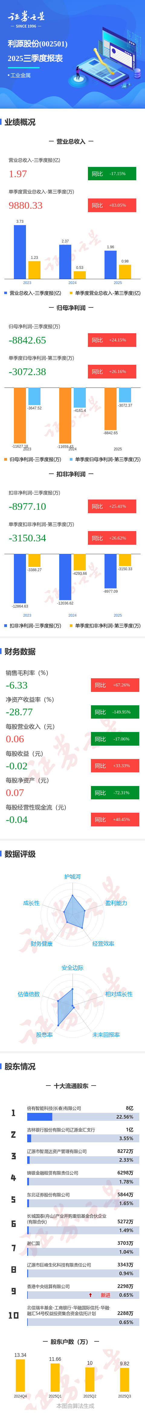 证券之星消息,利源股份2025年三季报显示,前三季度公司主营收入1.97亿元,同比下降17.15%;归母净利润-8842.65万元,同比上升24.16%;扣非净利润-8977.1万元,同比上升25.42%;其中2025年第三季度,公司单季度主营收入9880.33万元,同比上升83.06%;单季度归母净利润-3072.38万元,同比上升26.17%;单季度扣非净利润-3150.34万元,同比上升26.63%;负债率72.12%,投资收益-47.68万元,财务费用1096.43万元,毛利率-6.33%。