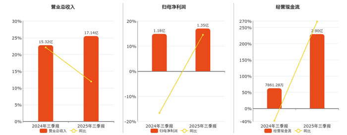 公司营业总收入为17.14亿元。归母净利润为1.35亿元。经营活动现金净流入为2.90亿元。