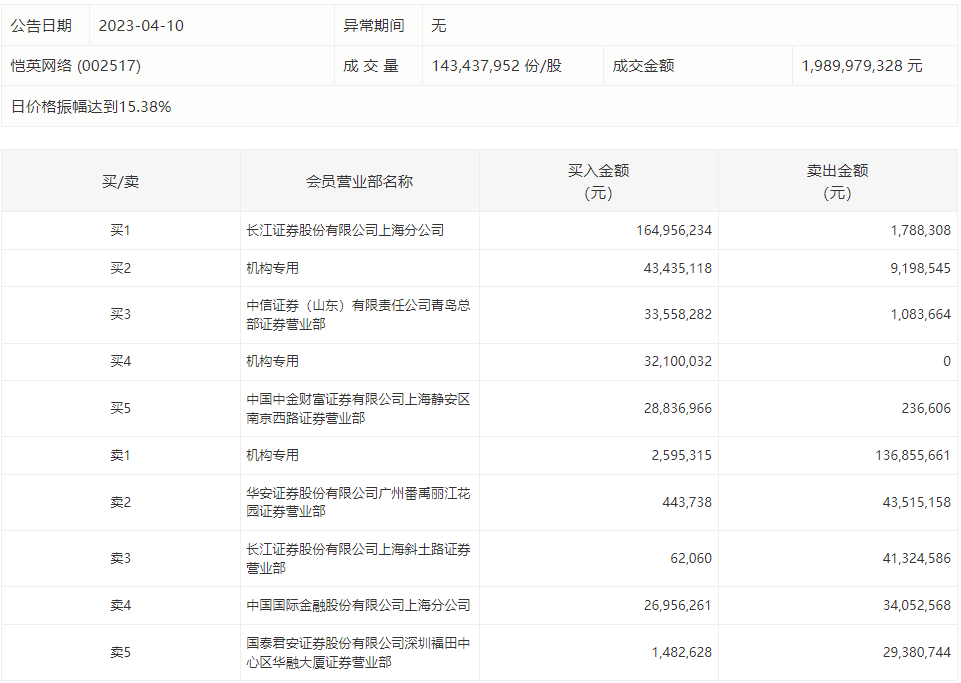 4月10日,恺英网络今日跌3.35%,龙虎榜数据显示,上榜营业部席位全天成交6.32亿元,占当日总成交金额比例为31.75%。其中,买入金额为3.34亿元,卖出金额为2.97亿元,合计净买入3699.08万元。