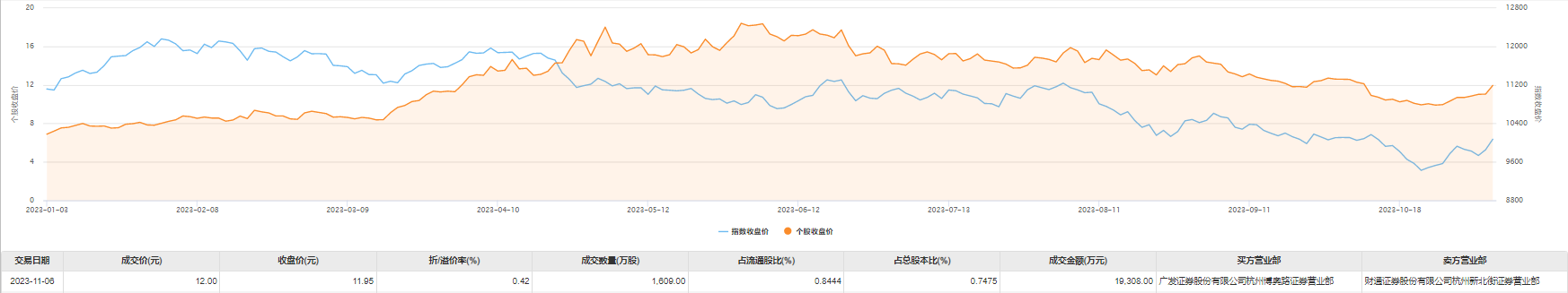 今日大宗交易成交1609万股,成交额1.93亿元,占当日总成交额的17.68%,成交价12元,较市场收盘价溢价0.42%。