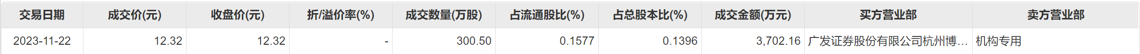 今日大宗交易成交300.5万股,成交额3702.16万元,占当日总成交额的3.68%,成交价12.32元,较市场收盘价持平。
