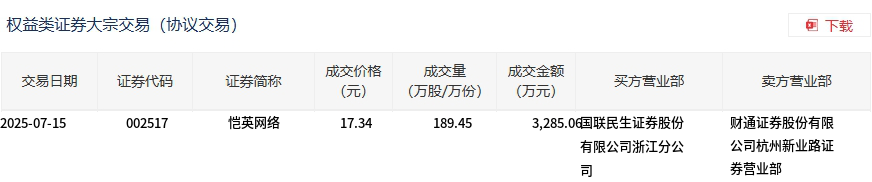 恺英网络今日大宗交易折价成交189.45万股,成交额3285.06万元