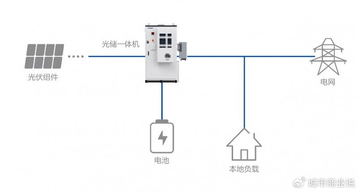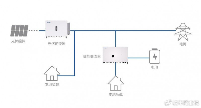 在交流耦合方案中,光伏发电系统与储能系统在交流侧并联。光伏组件产生的直流电(DC),首先通过一个独立的光伏逆变器转换为交流电(AC),这个交流电优先供给本地负载使用,余电也可以馈入电网。