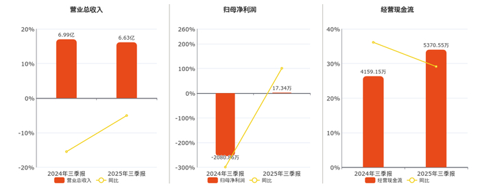 公司营业总收入为6.63亿元,较去年同报告期营业总收入减少3528.71万元,同比较去年同期下降5.05%。归母净利润为17.34万元。经营活动现金净流入为5370.55万元。
