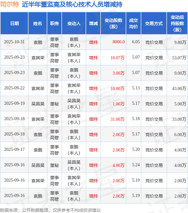 司尔特:10月31日高管袁鹏增持股份合计8000股