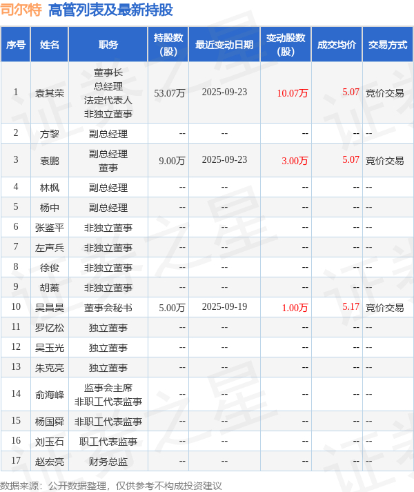 司尔特的高管列表及最新持股情况如下: