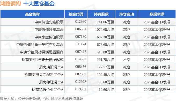 持有鸿路钢构最多的基金为中庚价值先锋股票,目前规模为32.36亿元,最新净值1.0649(10月27日),较上一交易日下跌0.88%,近一年上涨13.72%。该基金现任基金经理为陈涛。