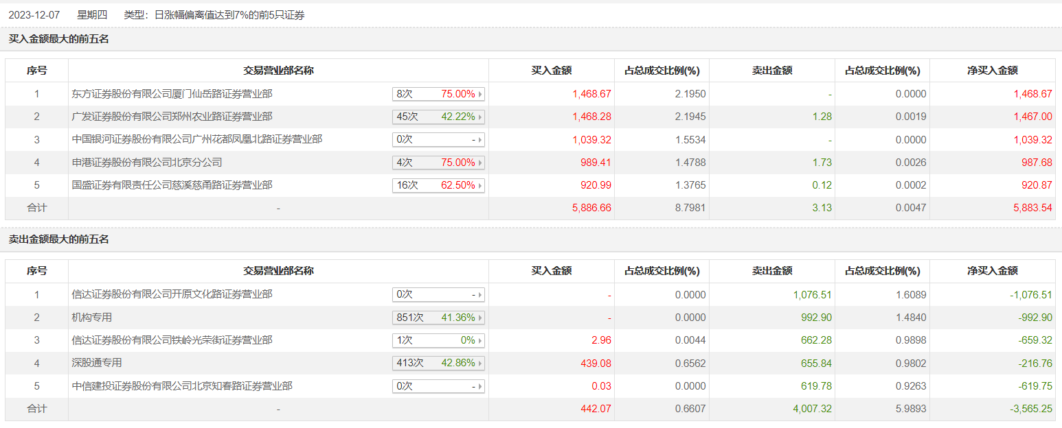 中化岩土(维权)12月7日涨停,全天换手率达14.52%,振幅达10.9%。龙虎榜数据显示,营业部席位合计净买入2318.29万元。其中,机构合计净卖出992.9万元。此外,东方证券厦门仙岳路证券营业部、广发证券郑州农业路证券营业部分别买入1468.67万元、1468.28万元;信达证券开原文化路证券营业部、信达证券铁岭光荣街证券营业部分别卖出1076.51万元、662.28万元。