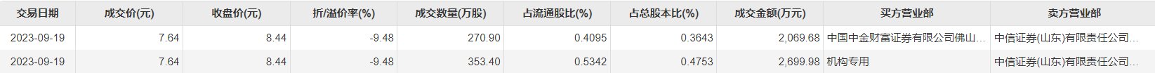 9月19日大宗交易成交624.3万股,成交额4769.66万元,占当日总成交额的58.68%,成交价7.64元,较市场收盘价8.44元折价9.48%。