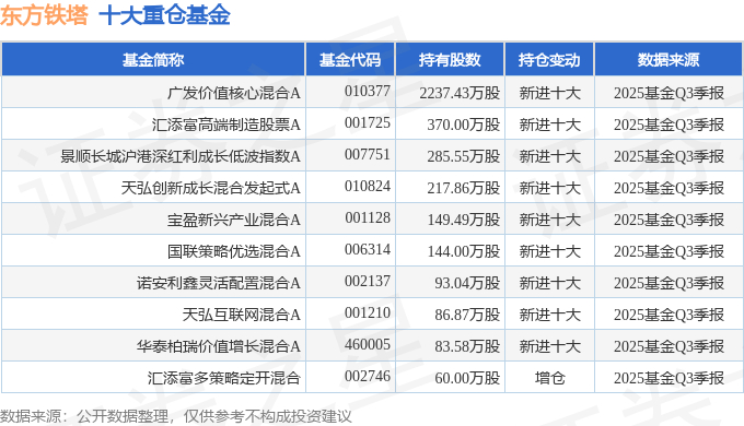 持有东方铁塔最多的基金为广发价值核心混合A,目前规模为40.9亿元,最新净值0.9544(10月30日),较上一交易日下跌2.2%,近一年上涨60.59%。该基金现任基金经理为吴远怡。