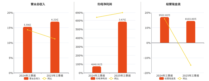 公司营业总收入为6.22亿元,在已披露的同业公司中排名第158。归母净利润为3.67亿元。经营活动现金净流入为8103.00万元,在已披露的同业公司中排名第119,较去年同报告期经营活动现金净流入减少1419.82万元,同比较去年同期下降14.91%。