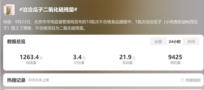 洽洽瓜子二氧化硫残留要追溯到2019年8月。彼时北京和广州市场监管局通报洽洽瓜子二氧化硫残留及霉菌超标。#洽洽瓜子二氧化硫残留#话题至今仍存在,在此次疑似内涵事件爆发前,相关阅读较少,但截至12月3日中午的24小时,阅读量骤升至1263万。过去30天,阅读量也只有1265万。
