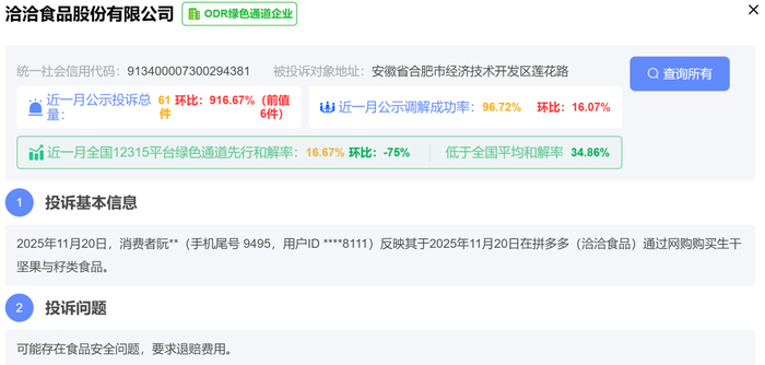12315举报平台上,消费者对洽洽食品的产品质量问题也是频频投诉,很多消费者投诉购买的坚果和瓜子等产品可能存在食品安全等问题,要求洽洽食品赔偿。仅近一个月,消费者在12315投诉平台上公示的投诉总量就达到61件,环比大涨916.67%。
