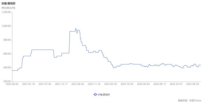东方财富Choice根据中国农业信息网的数据统计显示,葵花籽价格波动上涨主要在2020年8月至2022年6月。之后价格逐渐走低,从2023年下半年开始,葵花籽价格基本保持稳定。