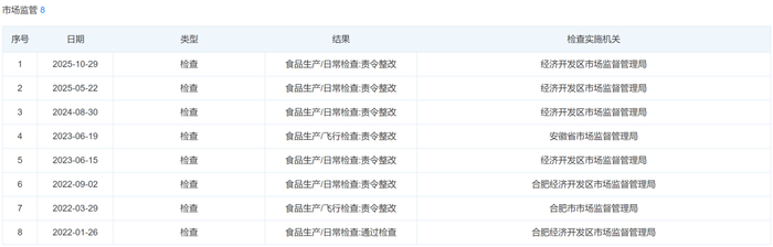 不仅如此,官方近三年的检查中,洽洽食品始终存在问题:天眼查显示,2022-2025年,安徽各级市场监管部门对洽洽食品的检查中,“食品生产/日常检查”仅在2022年1月通过一次,其余5次全部要求公司“责令整改”。