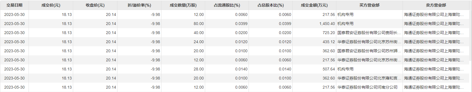5月30日大宗交易成交248万股,成交额4496.24万元,占当日总成交额的1.68%,成交价18.13元,较市场收盘价20.14元折价9.98%。