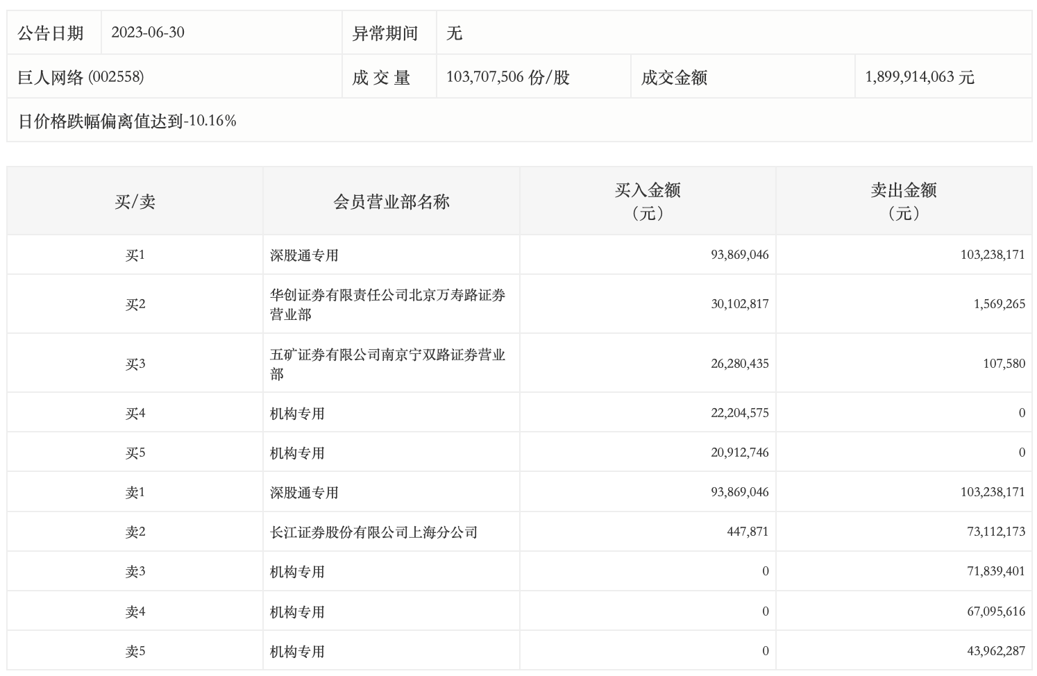 6月30日,巨人网络今日跌9.08%,龙虎榜数据显示,上榜营业部席位全天成交5.55亿元,占当日总成交金额比例为29.2%。其中,买入金额为1.94亿元,卖出金额为3.61亿元,合计净卖出1.67亿元。