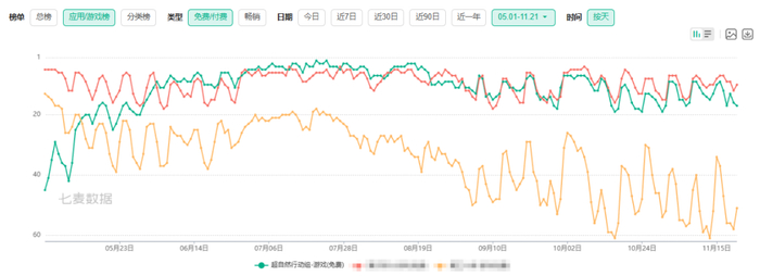从畅销榜曲线来看,《超自然行动组》的排名在6月开始快速上升,并在7月达到新高,此后基本长期处于Top 20的水平。相比之下,某行业王牌产品则加大了波动。