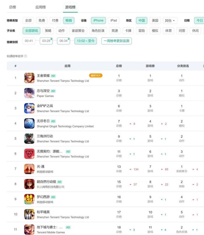 如果拉取最近半年的iOS榜单数据,你会发现《超自然行动组》与竞品的免费榜曲线和畅销榜曲线,确实展现出了明显的竞争态势。