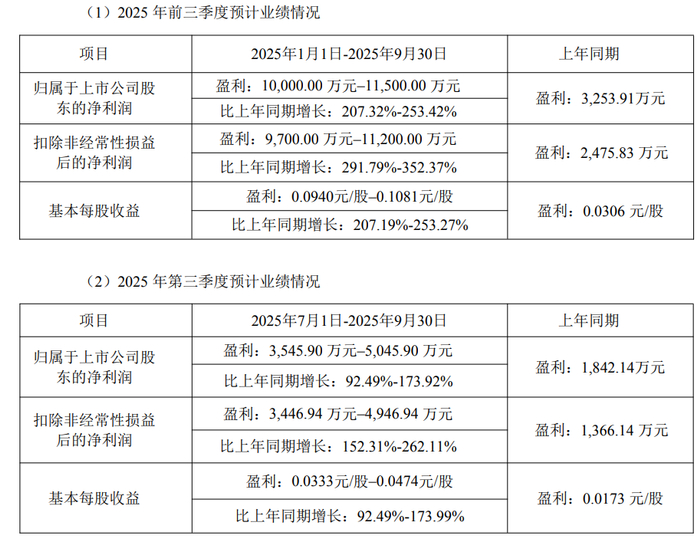 2025年前三季度,兄弟科技预计归属于上市公司股东的净利润盈利1.00亿元 – 1.15亿元,上年同期盈利0.33亿元,比上年同期增长207.32% - 253.42%;扣除非经常性损益后的净利润盈利0.97亿元 – 1.12亿元,上年同期盈利0.25亿元,比上年同期增长291.79% - 352.37%;基本每股收益盈利0.09元/股 – 0.11元/股,上年同期盈利0.03元/股,比上年同期增长207.19% - 253.27%。