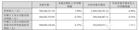 财报数据显示,百润股份前三季度营业收入为22.70亿元,同比下降4.89%,归母净利润为5.49亿元,同比下降4.35%。其中酒类业务前三季度实现主营业务收入19.78亿元,归母净利润为3.81亿元。而第三季度单季度公司营业收入为7.81亿元,同比增长2.99%,归母净利润同比下降6.76%至1.60亿元,总体上来说,业绩变化微小。