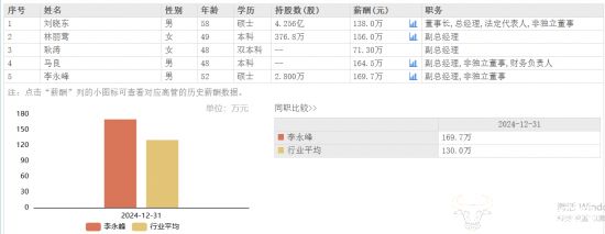 而李永峰2024年薪酬为169.7万元,是公司高管中的最高薪酬。也就是说,李永峰担任副总经理不到一年,其薪酬就高于了其他副总,甚至比董事长刘晓东还高。刘晓东2024年薪酬为138.0万元,相较于2023年的118.9万元,上涨了近20万元,但仍比李永峰低了31.7万元。