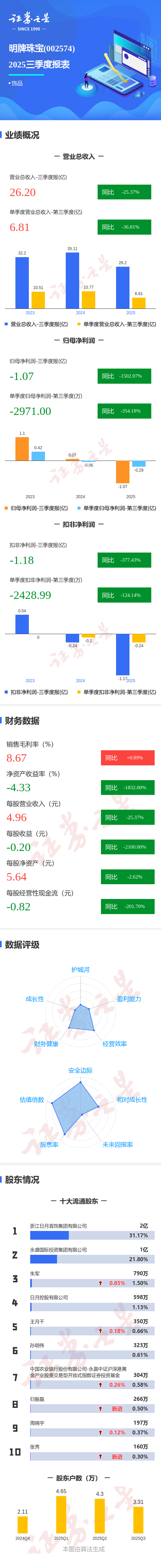 图解明牌珠宝三季报:第三季度单季净利润同比下降354.19%