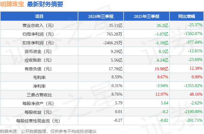 明牌珠宝(002574)2025年三季报简析:净利润同比下降1502.07%,三费占比上升明显