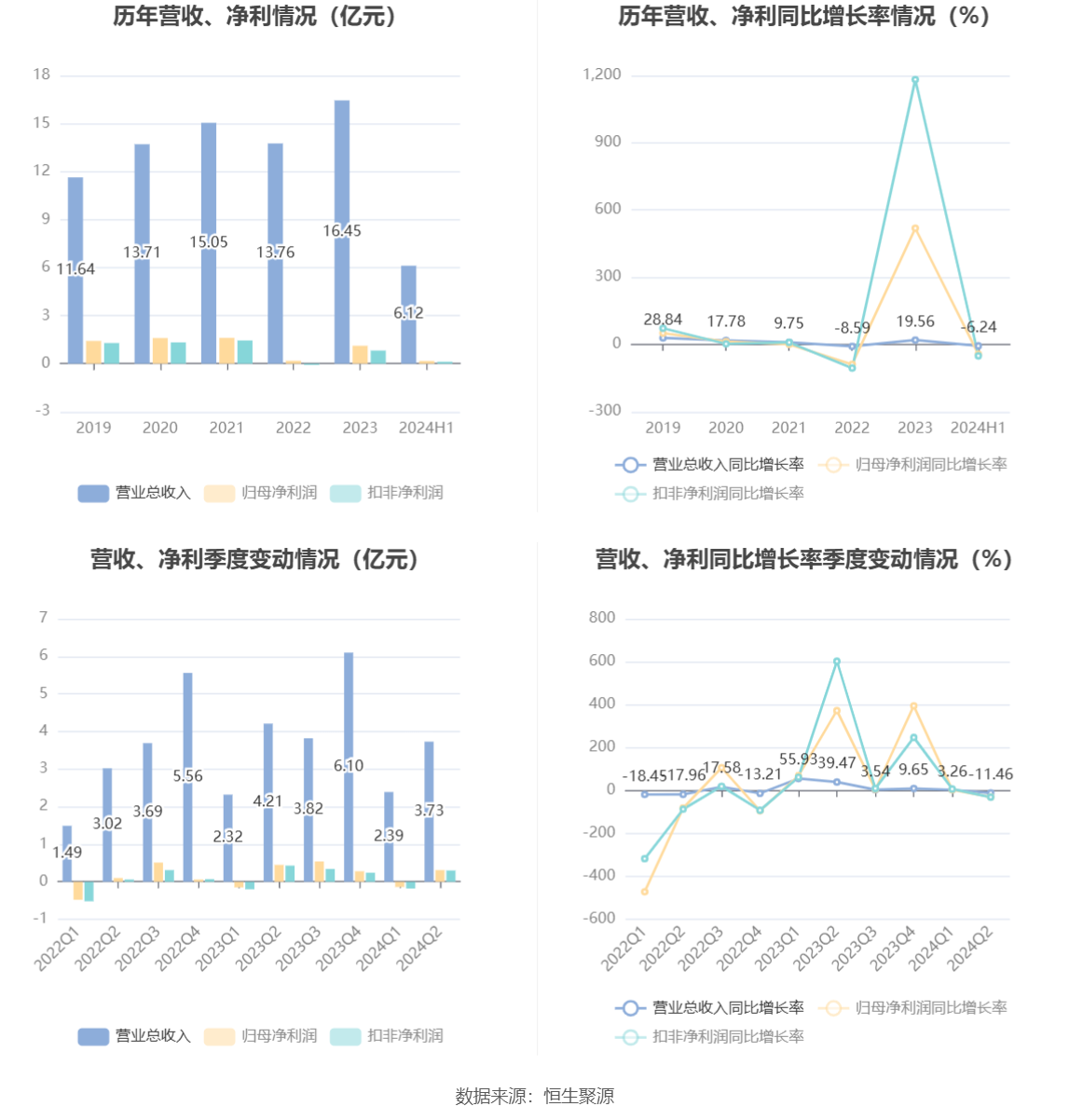根据半年报,公司第二季度实现营业总收入3.73亿元,同比下降11.46%,环比增长55.89%;归母净利润3143.85万元,同比下降30.16%,环比增长318.00%;扣非净利润2991.71万元,同比下降30.88%,环比增长263.28%。