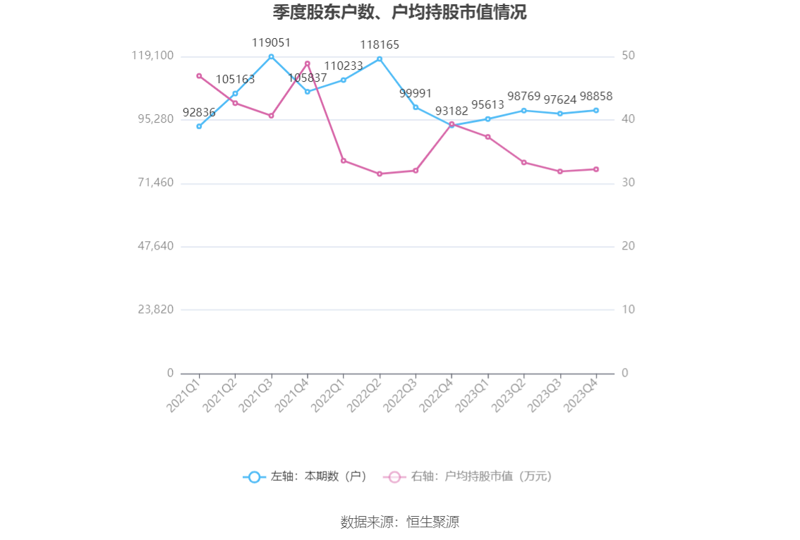 筹码集中度方面,截至2023年年末,公司股东总户数为9.89万户,较三季度末增长了1234户,增幅1.26%;户均持股市值由三季度末的31.87万元上升至32.21万元,增幅为1.07%。