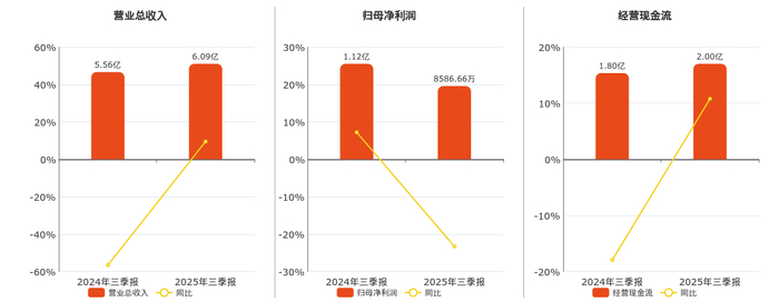 公司营业总收入为6.09亿元,较去年同报告期营业总收入增加5273.03万元,同比较去年同期上涨9.48%。归母净利润为8586.66万元,较去年同报告期归母净利润减少2607.27万元,同比较去年同期下降23.29%。经营活动现金净流入为2.00亿元,较去年同报告期经营活动现金净流入增加1941.83万元,同比较去年同期上涨10.77%。