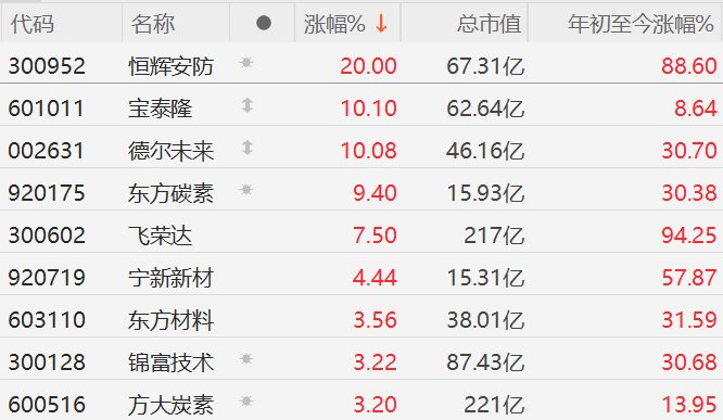 格隆汇10月10日|A股市场石墨烯概念股逆势走强,其中,恒辉安防20CM涨停,宝泰隆、德尔未来10CM涨停,东方碳素涨超9%,飞荣达涨超7%,宁新新材涨超4%,东方材料、锦富技术、方大炭素涨超3%。