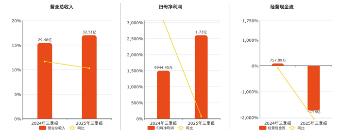 公司营业总收入为32.51亿元。归母净利润为1.73亿元。经营活动现金净流入为-1.48亿元,在已披露的同业公司中排名第60,较去年同报告期经营活动现金净流入减少1.55亿元,同比较去年同期下降2049.35%。