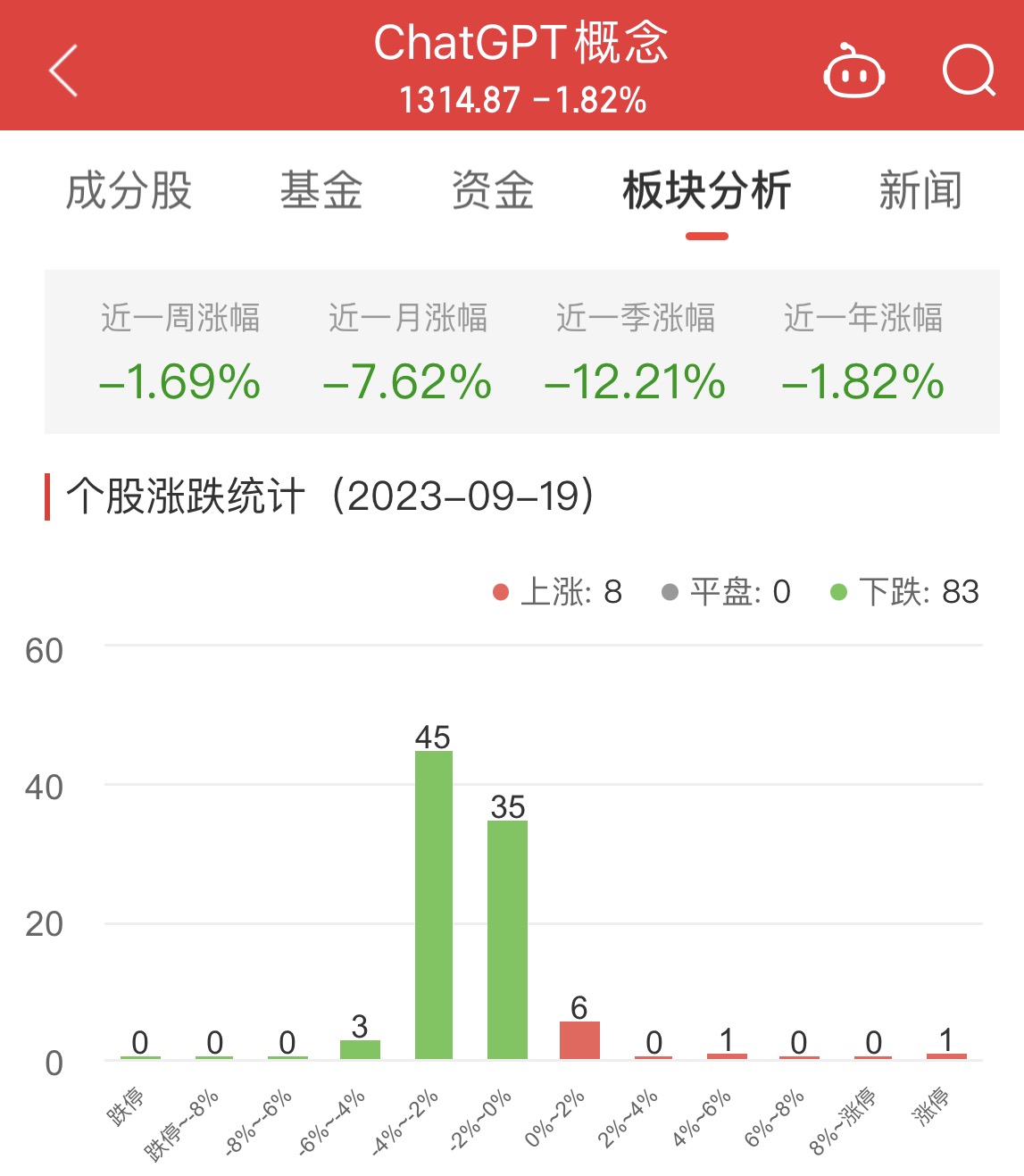 中国经济网北京9月19日讯今日,ChatGPT概念板块整体涨幅-1.82%,其中8只股票上涨,0只股票平盘,83只股票下跌。