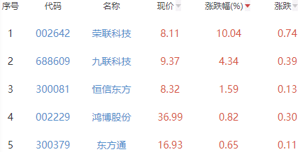 其中,荣联科技、九联科技、恒信东方、鸿博股份和东方通位列板块涨幅前五位,涨幅分别为10.04%、4.34%、1.59%、0.82%和0.65%。