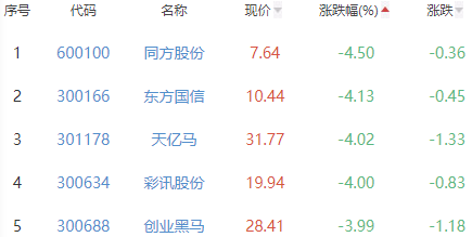 同方股份、东方国信、天亿马、彩讯股份和创业黑马位列涨幅榜后五位,涨幅分别为-4.50%、-4.13%、-4.02%、-4.00%和-3.99%。