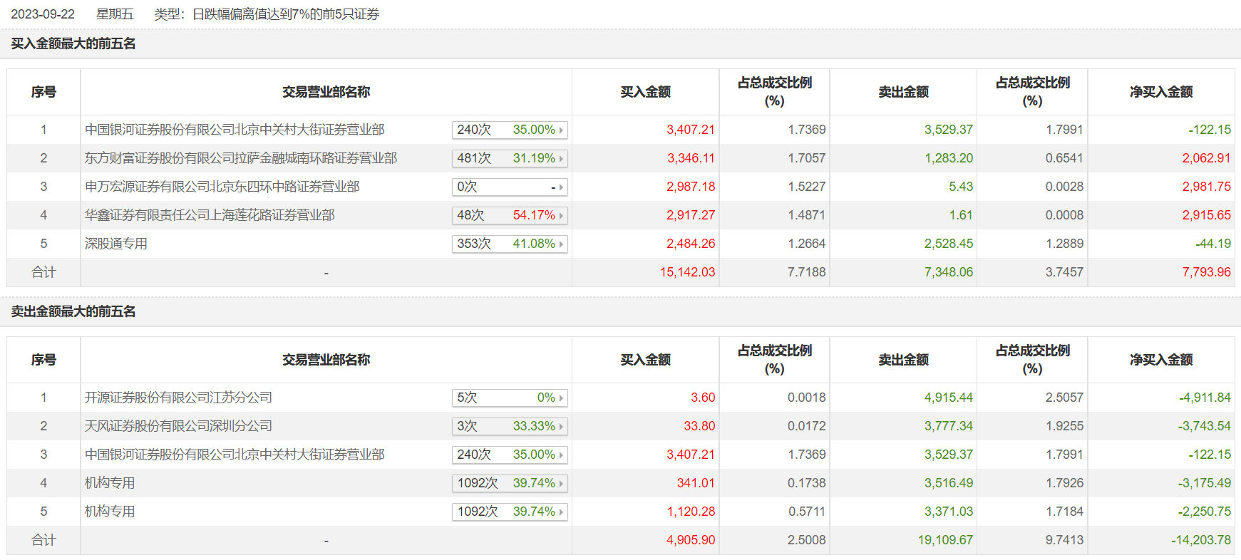 具体来看,机构买入1461.29万元,卖出6887.53万元,合计净卖出5426.24万元。此外,开源证券江苏分公司、天风证券深圳分公司分别卖出4915.44万元、3777.34万元;中国银河证券北京中关村大街证券营业部、东方财富证券拉萨金融城南环路证券营业部分别买入3407.21万元、3346.11万元。
