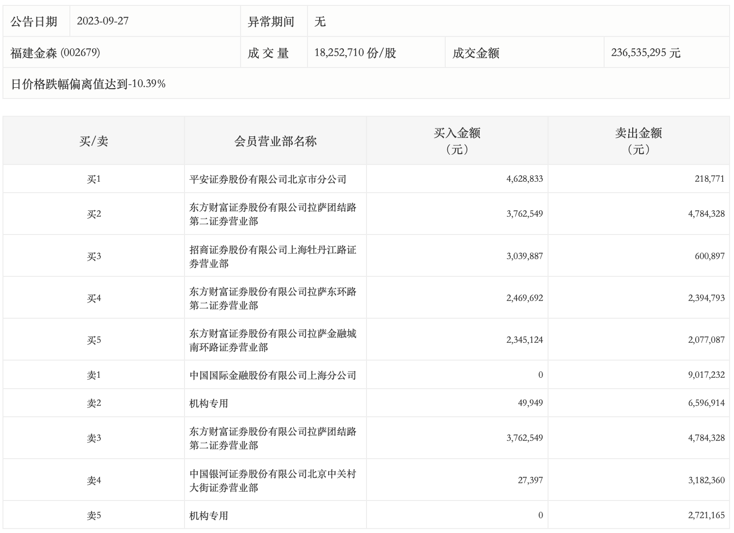 9月27日,福建金森今日跌停,全天换手率达7.74%,振幅达7.13%。龙虎榜数据显示,营业部席位合计净卖出1527.01万元。其中,机构买入4.99万元,卖出931.81万元,合计净卖出926.81万元。此外,中国国际金融上海分公司、东方财富证券拉萨团结路第二证券营业部分别卖出901.72万元、478.43万元;平安证券北京市分公司、东方财富证券拉萨团结路第二证券营业部分别买入462.88万元、376.25万元。