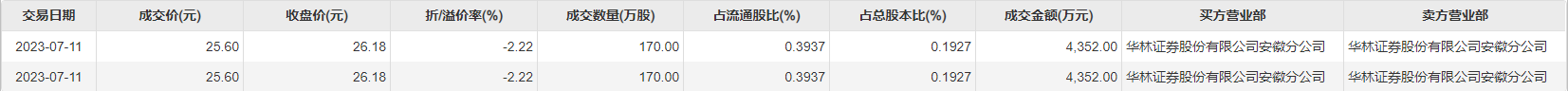 7月11日大宗交易成交340万股,成交额8704万元,占当日总成交额的57.53%,成交价25.6元,较市场收盘价26.18元折价2.22%。