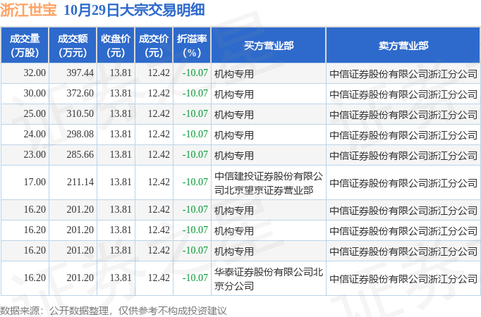 10月29日浙江世宝现10笔折价10.07%的大宗交易 合计成交2680.22万元