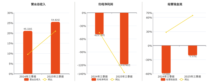 公司营业总收入为54.82亿元,在已披露的同业公司中排名第6,较去年同报告期营业总收入增加9.50亿元,实现3年连续上涨,同比较去年同期上涨20.96%。归母净利润为-1478.40万元,在已披露的同业公司中排名第17,较去年同报告期归母净利润减少855.03万元。经营活动现金净流入为-1.11亿元,在已披露的同业公司中排名第20,较去年同报告期经营活动现金净流入增加1.99亿元,实现2年连续上涨。