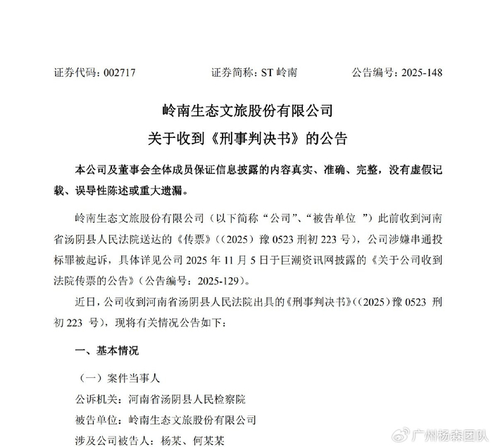 2025年12月17日,岭南股份002717披露关于收到《刑事判决书》的公告,近日公司被判犯串通投标罪,判处罚金人民币六十万元。