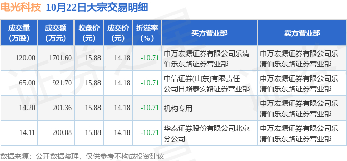 10月22日电光科技现4笔折价10.71%的大宗交易 合计成交3024.74万元