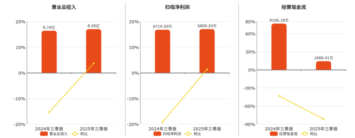 公司营业总收入为8.49亿元。归母净利润为6809.24万元。经营活动现金净流入为1680.41万元,在已披露的同业公司中排名第67,较去年同报告期经营活动现金净流入减少7425.77万元,同比较去年同期下降81.55%。