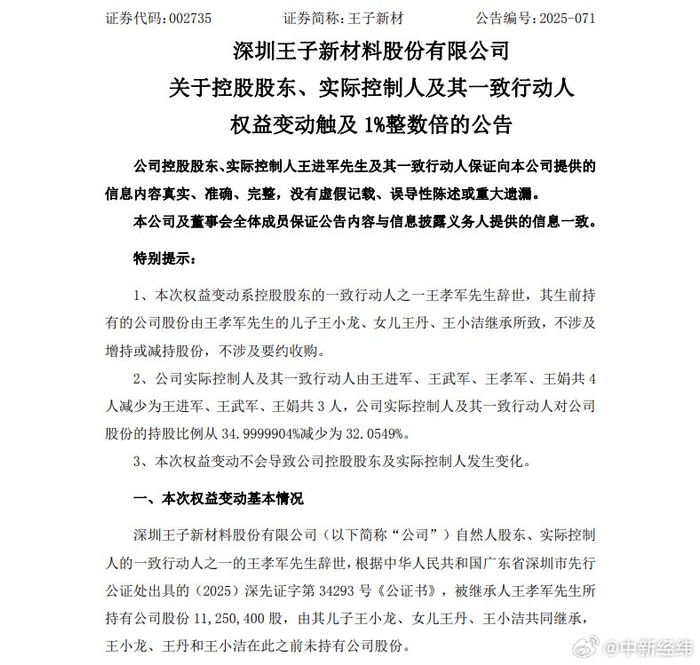 【#A股公司股东去世子女继承1.8亿遗产#】#股东去世1.8亿遗产三子女继承# 16日晚间,王子新材发布公告称,公司控股股东、实际控制人的一致行动人之一王孝军辞世,其持有的公司股份1125.04万股由其子王小龙、女儿王丹、王小洁继承。具体来看,王小龙获取王子新材562.52万股,占公司总股本的1.47%;王丹、王小洁均获取281.26万股,分别占公司总股本的0.74%。据悉,上述继承事项已于12月15日完成过户登记手续。按照12月15日收盘价16.05元/股计算,王孝军持有的1125.04万股价值为1.81亿元。截至12月16日收盘,王子新材股价报15.13元/股,总市值为57.8亿元。