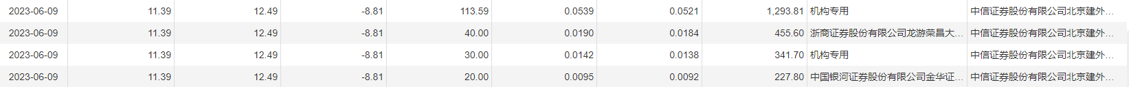6月9日大宗交易成交1473.59万股,成交额1.68亿元,占当日总成交额的24.24%,成交价11.39元,较市场收盘价12.49元折价8.81%。