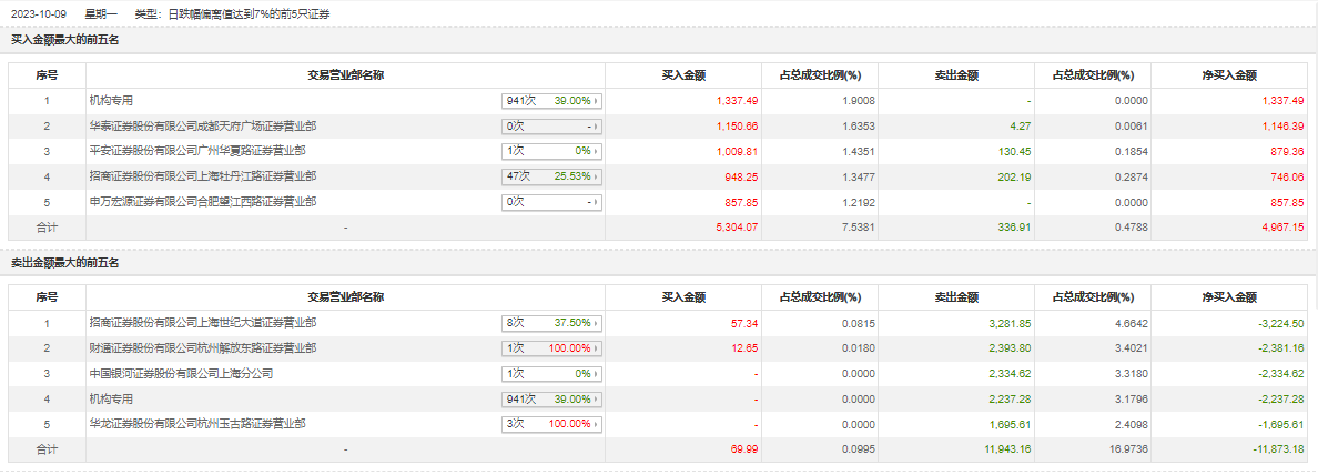 具体来看,机构买入1337.49万元,卖出2237.28万元,合计净卖出899.79万元。此外,招商证券上海世纪大道证券营业部、财通证券杭州解放东路证券营业部分别卖出3281.85万元、2393.80万元;华泰证券成都天府广场证券营业部、平安证券广州华夏路证券营业部分别买入1150.66万元、1009.81万元。