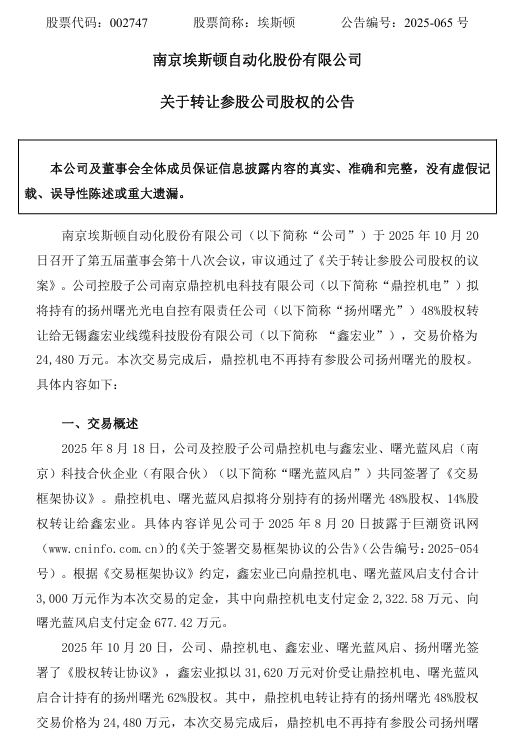 新华日报财经讯 10月20日,埃斯顿(股票代码:002747.SZ)发布公告称,公司控股子公司南京鼎控机电科技有限公司拟将持有的扬州曙光光电自控有限责任公司48%股权转让给无锡鑫宏业线缆科技股份有限公司,交易价格为2.448亿元。交易完成后,鼎控机电将不再持有扬州曙光的股权。这已是埃斯顿四个月内第二次出售扬州曙光股权。